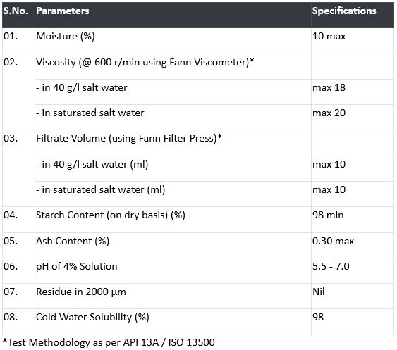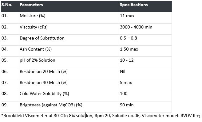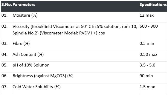 *Brookfield Viscometer at 50°C in 5% solution, Rpm 10, Spindle no.02, Viscometer model: RVDV II +; Viscosity are measured after the starch is sieved through 100 (Count per inch) mesh screen.